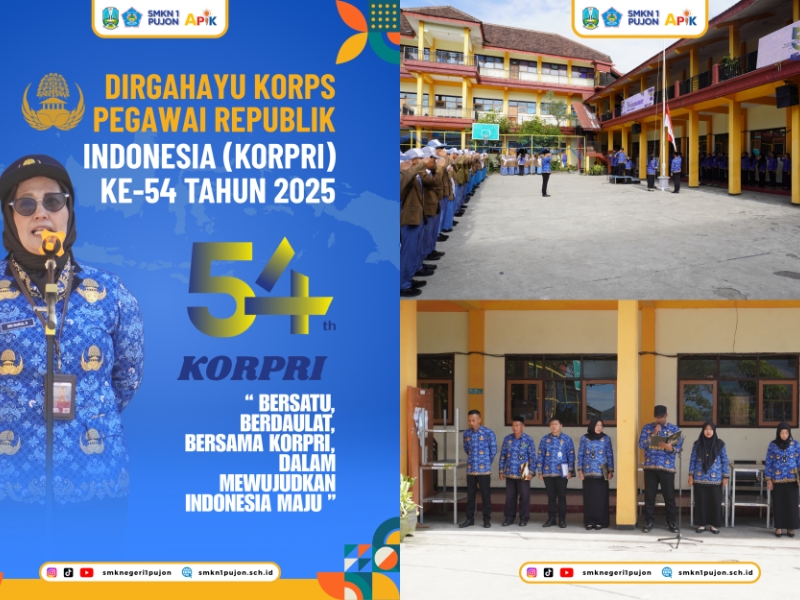 Dalam rangka memperingati Dirgahayu Korps Pegawai Republik Indonesia (KORPRI) ke-54 Tahun 2025, SMKN 1 PUJON melaksanakan upacara bendera secara khidmat sebagai wujud rasa syukur dan penghormatan terhadap pengabdian seluruh pegawai negeri sipil di Indonesia. Dengan mengusung tema “Bersatu, Berdaulat, Bersama...